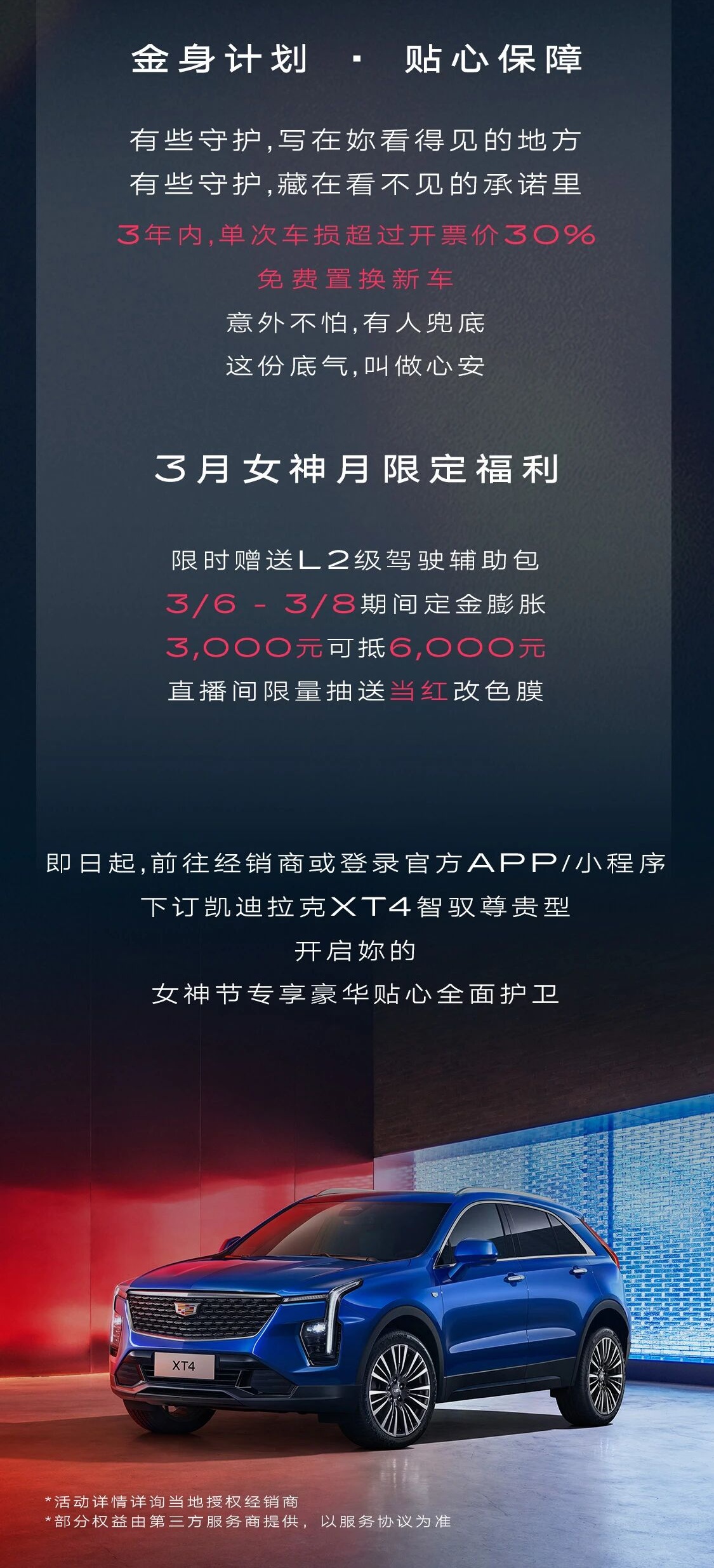 凯迪拉克表示,即日起至 2026 年 3 月 8 日,购车用户可参与限时活动:获赠标称价值 1 万元的 L2 辅助驾驶功能包、3000 元定金抵扣 6000 元购车款,直播间抽奖改色车膜。品牌同步推出车辆置换权益:车损超过 30% 可免费更换等价新车。