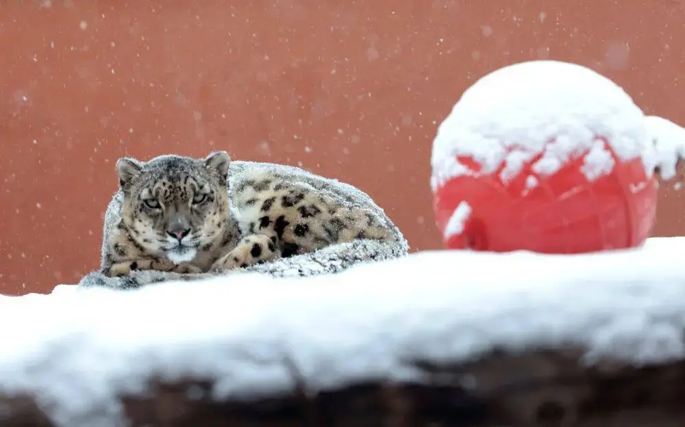 在西宁野生动物园,雪豹在覆盖着白雪的木板上休憩。(李宁 摄)