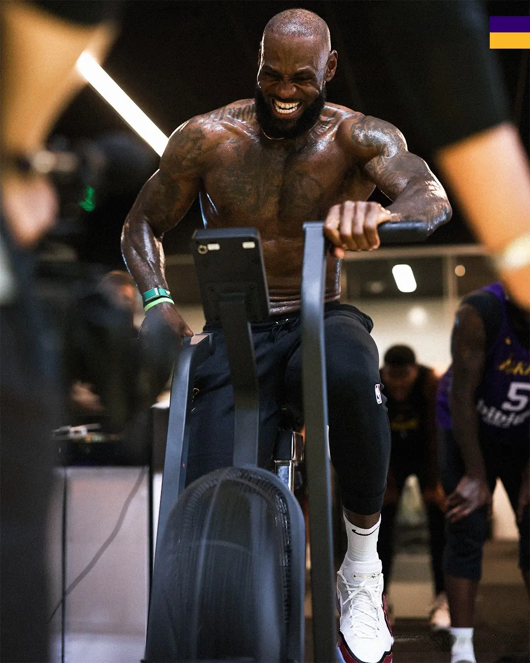 今日詹姆斯继续带队备战系列赛G1,他在健身房中光着膀子卖力咬牙苦练,早已练得浑身大汗并且累得吐舌,展示完美身材;41岁老詹是联盟自律的典范,据悉他每年花费百万美元保养身体,自律与苦练是他取得伟大成就的原因之一。